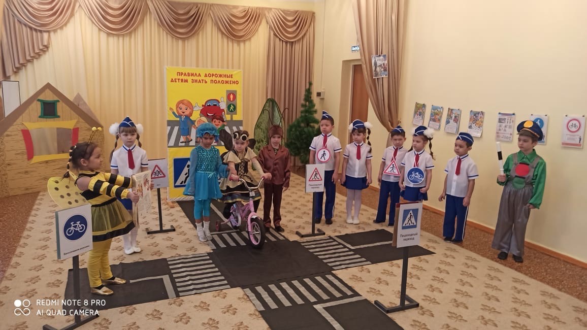 Оборудование: костюмы, велосипед, дорожные знаки, дорога (банер), жезл, фликер.